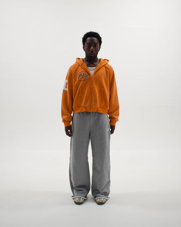 The Racing Club Hoodie features a relaxed fit with a dropped shoulder design, front pouch pockets, ribbing at the wrists and waist, and finished in a orange washed french terry fabric.
